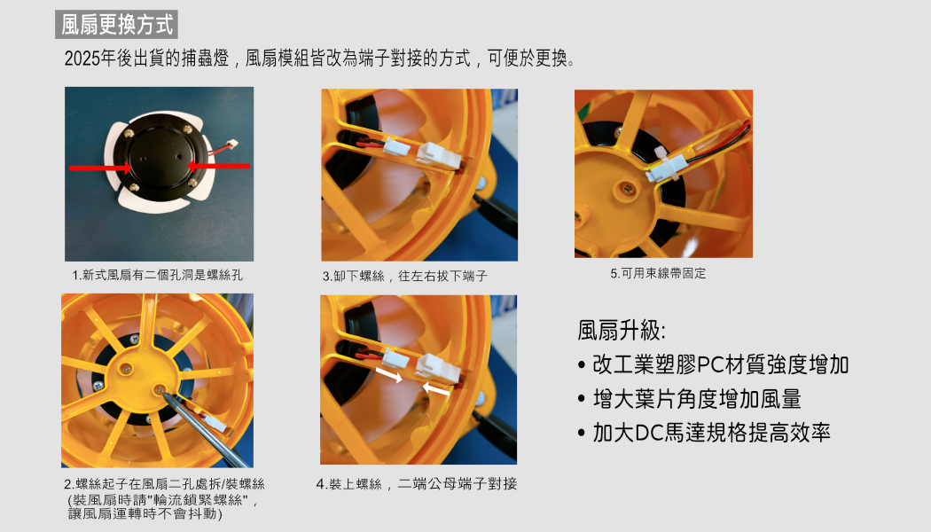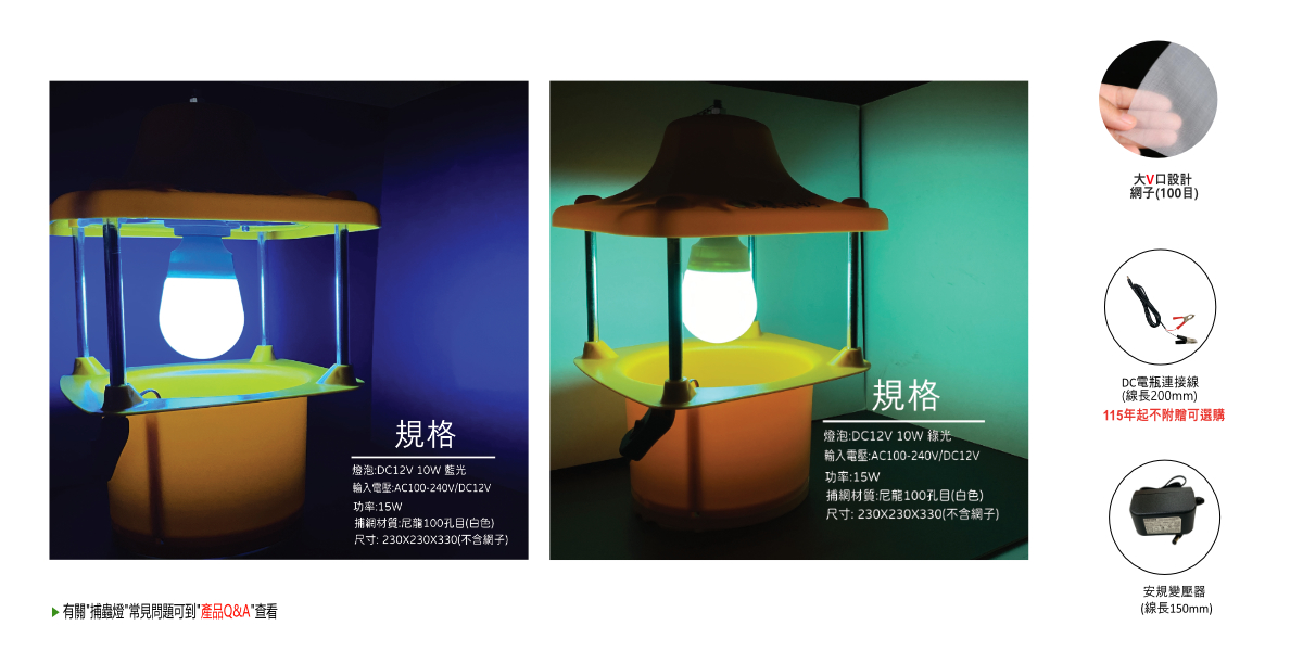 桃園區農業改良場技術授權及合作開發,利用CCFL高效能的UVA球泡燈,表面塗上光觸媒,具有雙重效能,設計大V口捕蟲網,採吸入方式捕抓,可有效防治害蟲。